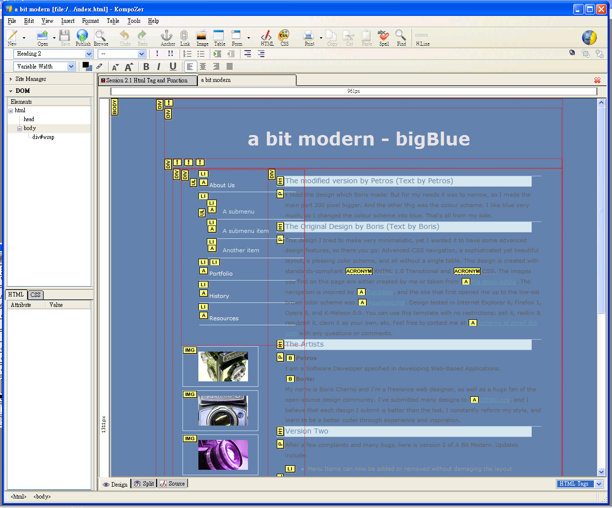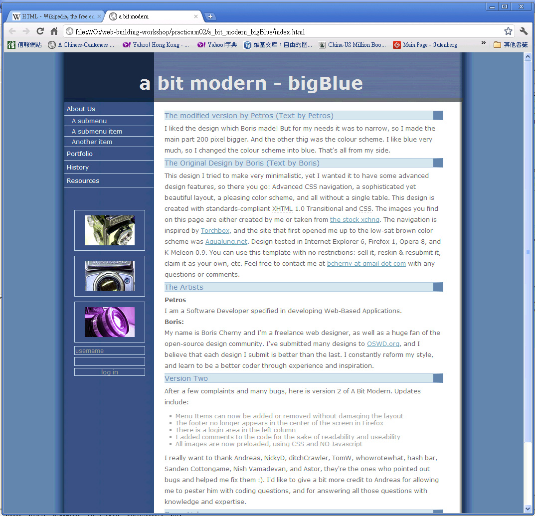 | <html xmlns="http://www.w3.org/1999/xhtml"> <head> <meta http-equiv="Content-Type" content="text/html; charset=iso-8859-1" /> <title>a bit modern</title> <!-- I linked to the stylesheet using two methods, the @import method as well as the link rel method, to ensure maximum accessibility --> <style type="text/css" media="all"> <!-- @import url(styles.css); --> </style> <link rel="stylesheet" type="text/css" href="styles.css" media="all" /> </head> <body> <div id="wrap"><!-- start of container --> <div id="header">a bit modern - bigBlue</div> <div id="content"><!-- left column, contains navigation and photos --> <div id="column1"> <div id="nav"> <ul> <li><a href="#" accesskey="a">About Us</a></li> <li> <ul> <li><a href="#" accesskey="1">A submenu</a></li> <li><a href="#" accesskey="2">A submenu item</a></li> <li><a href="#" accesskey="3">Another item</a></li> </ul> </li> <li><a href="#" accesskey="p">Portfolio</a></li> <li><a href="#" accesskey="h">History</a></li> <li><a href="#" accesskey="r">Resources</a></li> </ul> </div> <img src="Images/camera1.gif" alt="" height="60" width="100" /> <img src="Images/camera2.gif" alt="" /> <img src="Images/camera3.gif" alt="" /> <form action="#"> <input class="login" value="username" onfocus="this.value=''" onmouseover="this.className='login_hover'" onmouseout="this.className='login'" type="text" /> <input class="login" onfocus="this.value=''" onmouseover="this.className='login_hover'" onmouseout="this.className='login'" type="password" /> <div id="submit" onmouseover="this.id='submit_hover'" onmouseout="this.id='submit'" onclick="location.href='#'">log in</div> </form> </div> <!-- end of left column --><!-- right column, this is the main content area, and where the links are --> <div id="column2"> <h1>The modified version by Petros (Text by Petros)</h1> <p>I liked the design which Boris made! But for my needs it was to narrow, so I made the main part 200 pixel bigger. And the other thig was the colour scheme. I like blue very much, so I changed the colour scheme into blue. That's all from my side.</p> <h1>The Original Design by Boris (Text by Boris)</h1> <p>This design I tried to make very minimalistic, yet I wanted it to have some advanced design features, so there you go: Advanced CSS navigation, a sophisticated yet beautiful layout, a pleasing color scheme, and all without a single table. This design is created with standards-compliant <acronym title="Extensible Hypertext Markup Language">XHTML</acronym> 1.0 Transitional and <acronym title="Cascading Style Sheets">CSS</acronym>. The images you find on this page are either created by me or taken from <a href="http://www.sxc.hu">the stock xchng</a>. The navigation is inspired by <a href="http://torchbox.com/">Torchbox</a>, and the site that first opened me up to the low-sat brown color scheme was <a href="http://www.aqualung.net">Aqualung.net</a>. Design tested in Internet Explorer 6, Firefox 1, Opera 8, and K-Meleon 0.9. You can use this template with no restrictions: sell it, reskin & resubmit it, claim it as your own, etc. Feel free to contact me at <a href="mailto:bcherny@gmail.com">bcherny at gmail dot com</a> with any questions or comments.</p> <h1>The Artists</h1> <p> <b>Petros</b><br /> I am a Software Developer specified in developing Web-Based Applications. <br /> <b>Boris:</b><br /> My name is Boris Cherny and I'm a freelance web designer, as well as a huge fan of the open-source design community. I've submitted many designs to <a href="http://www.oswd.org">OSWD.org</a>, and I believe that each design I submit is better than the last. I constantly reform my style, and learn to be a better coder through experience and inspiration.</p> <h1>Version Two</h1> <p>After a few complaints and many bugs, here is version 2 of A Bit Modern. Updates include:</p> <ul> <li>Menu Items can now be added or removed without damaging the layout</li> <li>The footer no longer appears in the center of the screen in Firefox</li> <li>There is a login area in the left column</li> <li>I added comments to the code for the sake of readability and useability</li> <li>All images are now preloaded, using CSS and NO Javascript</li> </ul> <p>I really want to thank Andreas, NickyD, ditchCrawler, TomW, whowrotewhat, hash bar, Sanden Cottongame, Nish Vamadevan, and Astor, they're the ones who pointed out bugs and helped me fix them :). I'd like to give a bit more credit to Andreas for allowing me to pester him with coding questions, and for answering all those questions with knowledge and expertise.</p> <h1>Some Links</h1> <div id="links"> <div> <ul> <li><a href="http://www.hicksdesign.co.uk/">hicksdesign</a></li> <li><a href="http://www.im-visions.com/start/">Intuitivmedia</a></li> <li><a href="http://www.jeremy-fields.com/">Jeremy Fields</a></li> <li><a href="http://solardreamstudios.com/">solarDreamStudios</a></li> </ul> </div> <div> <ul> <li><a href="http://www.stopdesign.com/">Stopdesign</a></li> <li><a href="http://www.studiotwentyeight.com/">StudioTwentyEight</a></li> <li><a href="http://www.t26.com/fonts.php">T.26</a></li> <li><a href="http://torchbox.com/">torchbox</a></li> </ul> </div> </div> </div> </div> <!-- end of right column --><!-- remove my name from the footer if you want, this is open source ;) --> <div id="footer"> Original design by <a href="http://www.bcdesignplace.com">Boris Cherny</a>. (c) 2005 your corporation. Modified version by <a href="http://www.peman.de">Petros Dolaschjan </a> </div> <!-- end of container --></div> </body> </html> |
